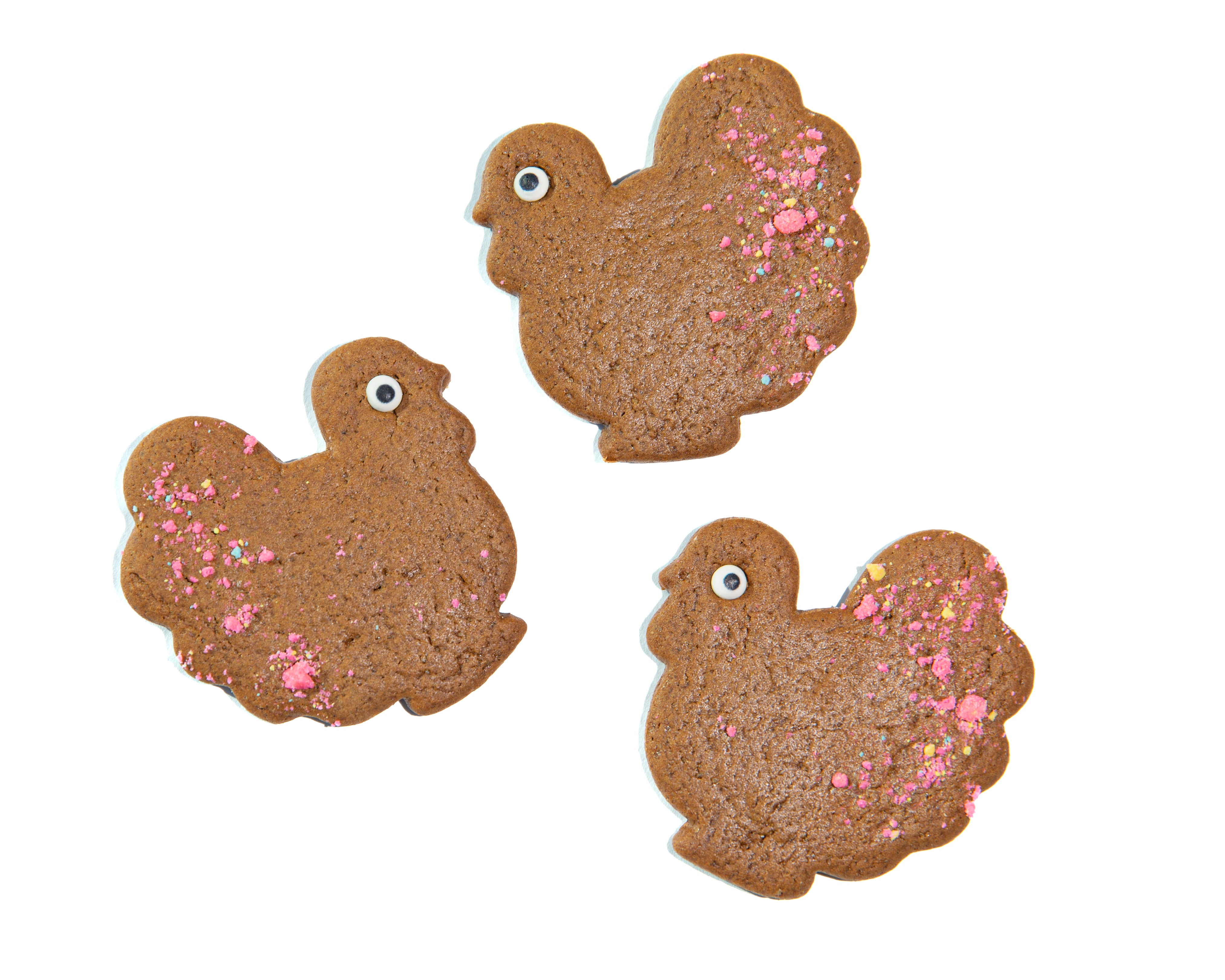 Uncle Chip's hand made, hand rolled and hand cut gingerbread ready to liven up Thanksgiving. Spread some good gobble vibes with these cookies. Cookies are packaged in compostable PLA bag. Each piece includes 2 cookies stuffed with royal icing in the middle.